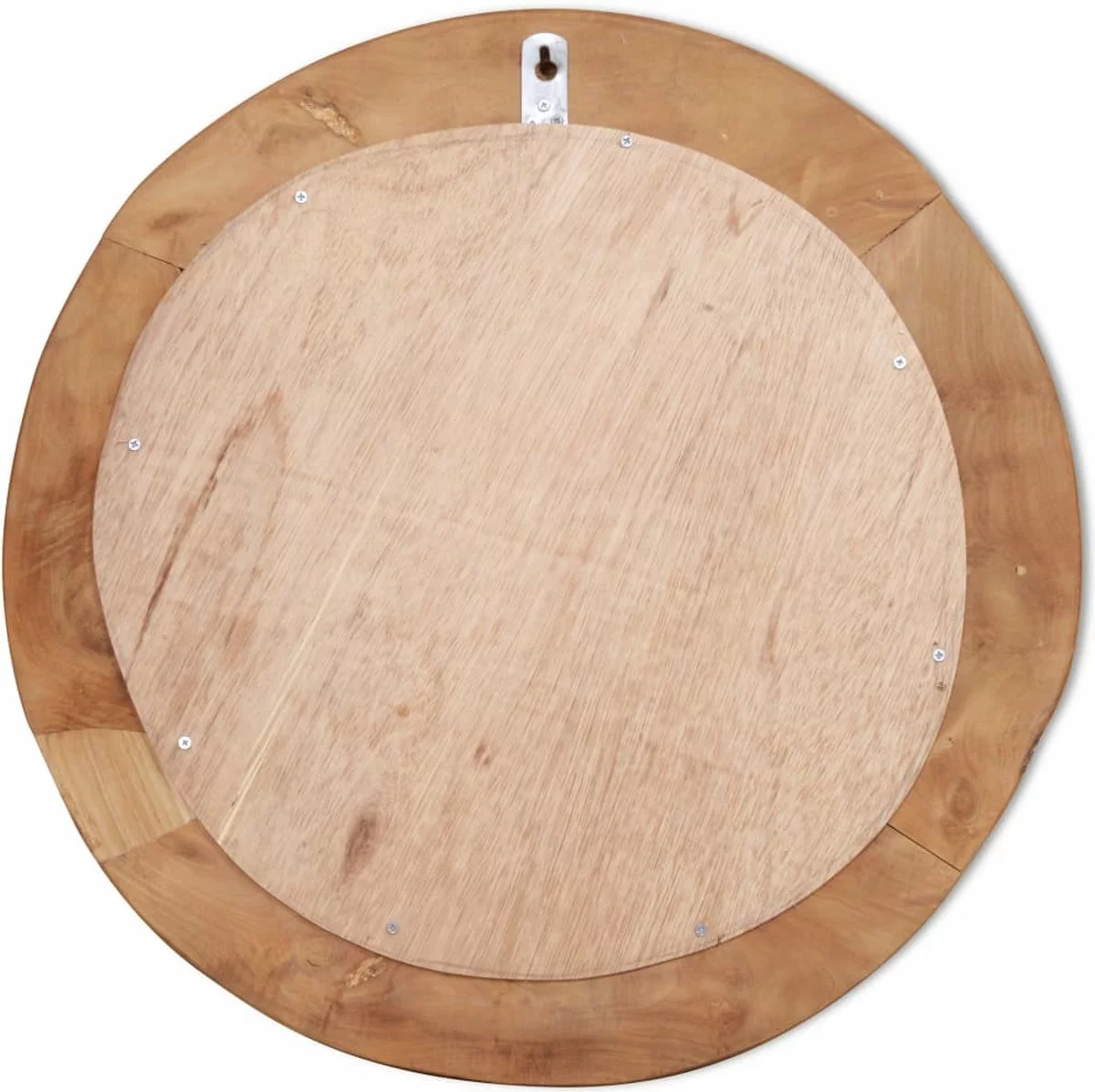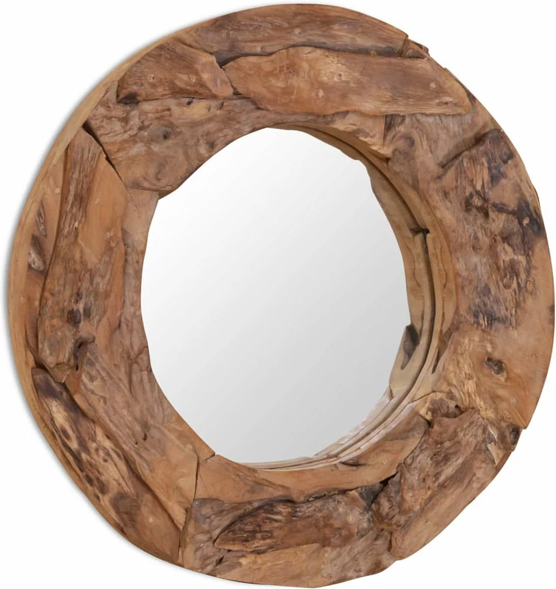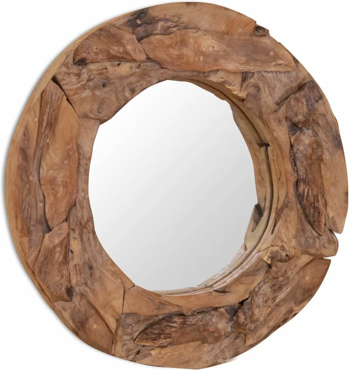 De spiegel is gemaakt van massief teakhout dat op een willekeurige manier is geplaatst, dit draagt bij aan de rustieke stijl van de spiegel. Deze spiegel ziet er goed uit in iedere kamer, en kan ook worden gebruikt in de badkamer.