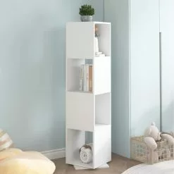 Deze staande kast is gemaakt van hoogwaardig spaanplaat en is buitengewoon duurzaam en stabiel. De draaikast is 360 graden draaibaar en neemt slechts een klein vloeroppervlak in beslag. De ruime vakken bieden plaats aan al je decoratieve objecten, planten, speelgoed, enz. Deze opbergkast is gemakkelijk schoon te maken met een vochtige doek.