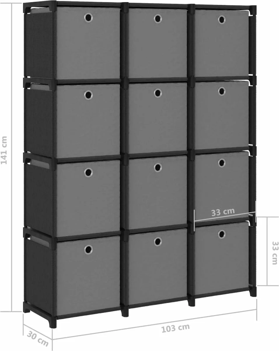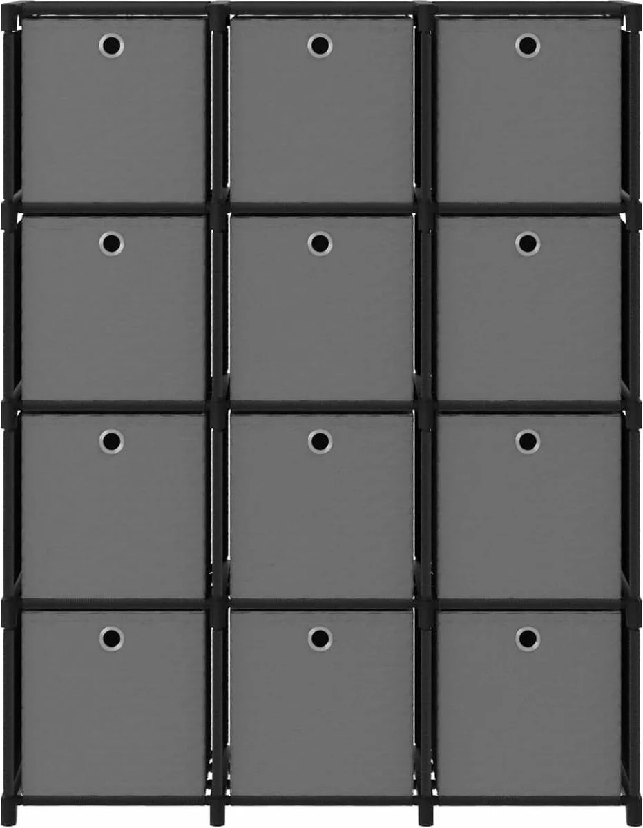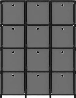 De kast is gemaakt van stof met een stalen frame, waardoor hij sterk en stabiel is. Deze vrijstaande kast heeft 12 open vakken en elk vak heeft een stoffen doos om je spullen en kamer netjes te houden. De dozen kunnen verwijderd worden zodat je boeken, verzamelobjecten, foto’s, onderscheidingen, kleine planten, enz. in de vakken kunt plaatsen.