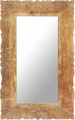 Massief mangohout is een tropisch hardhout. Het heeft de kracht om veel gewicht te dragen en is bestand tegen slijtage. Bovendien zorgen het voortreffelijke vakmanschap en de prachtige houtnerven ervoor dat elke houten spiegel net iets anders is dan de rest. Het met de hand gesneden patroon draagt bij aan de schoonheid.