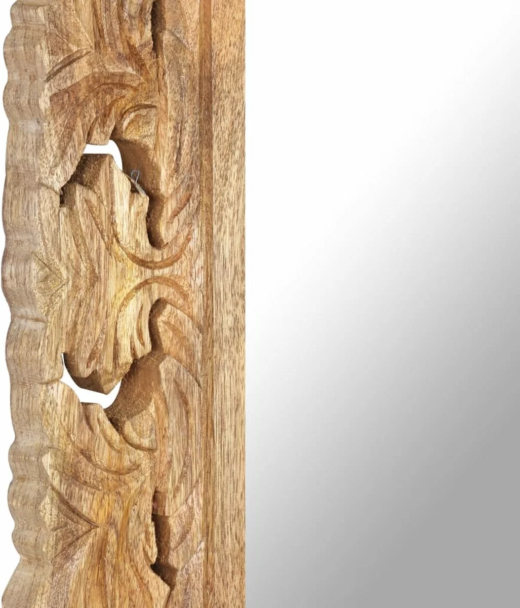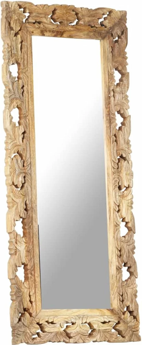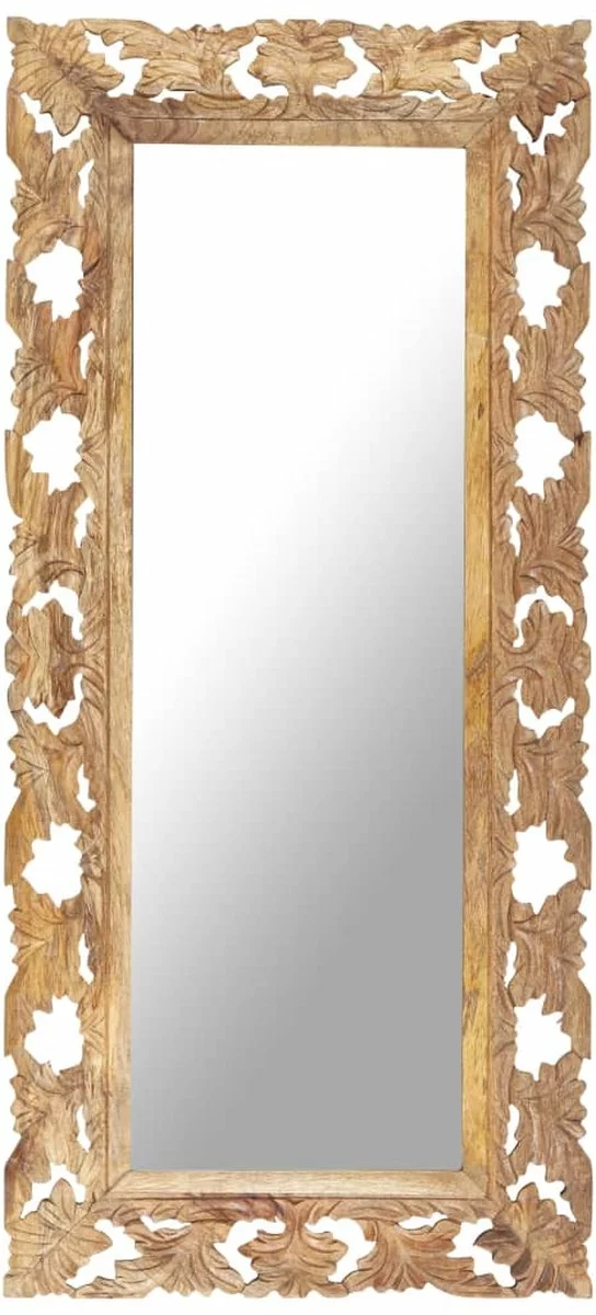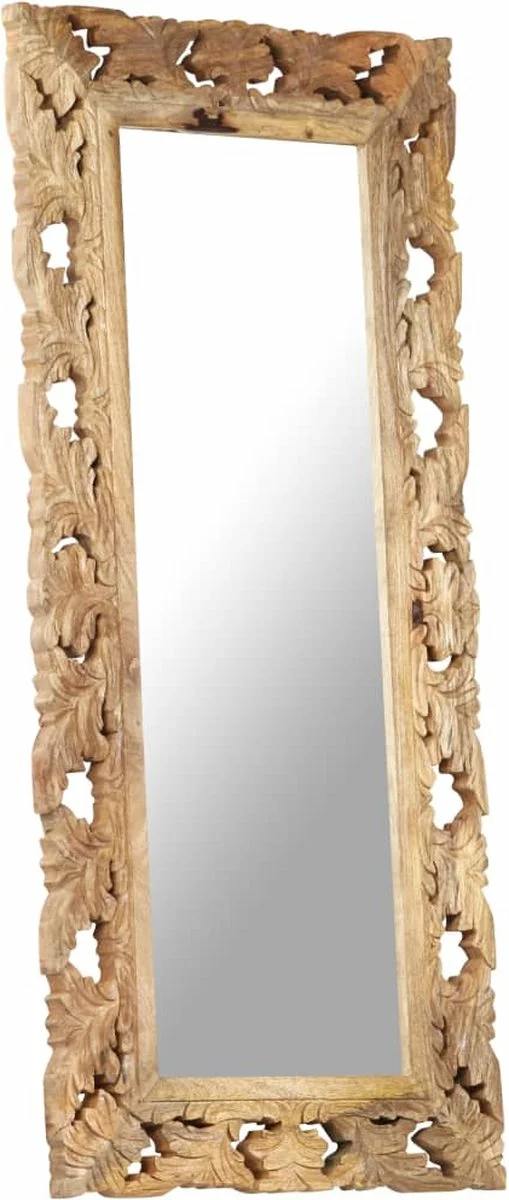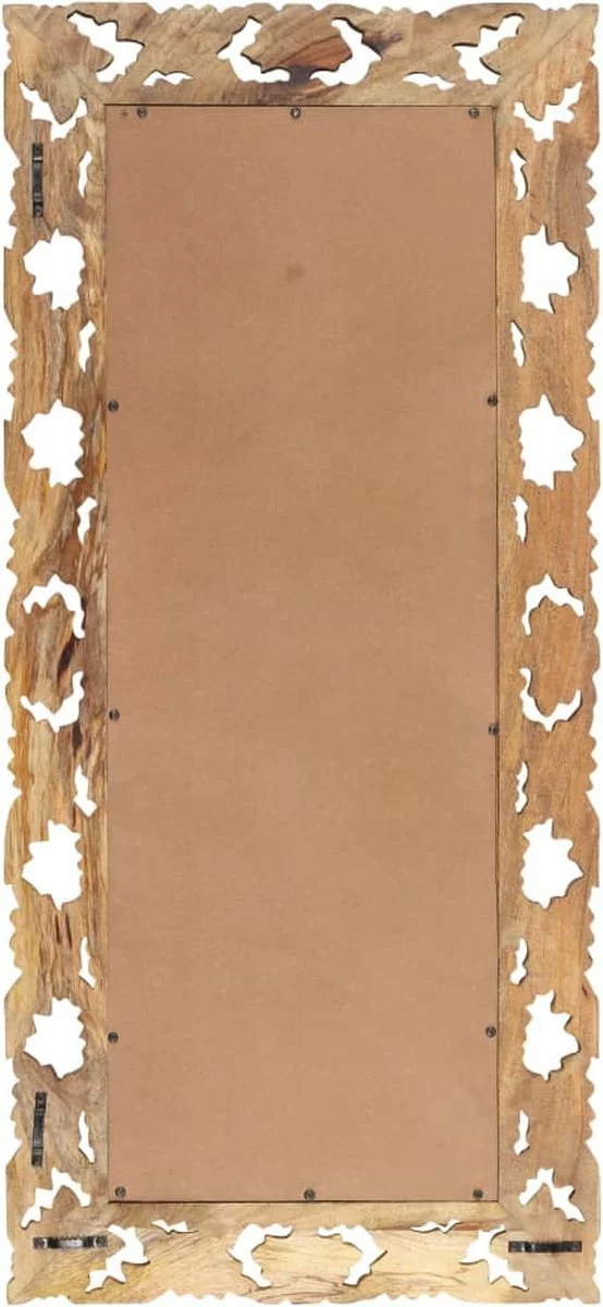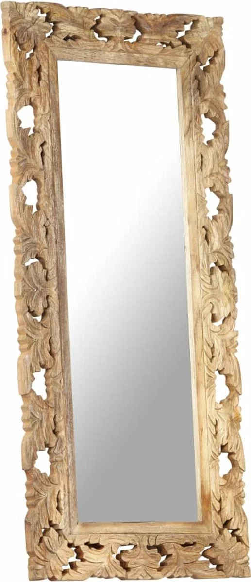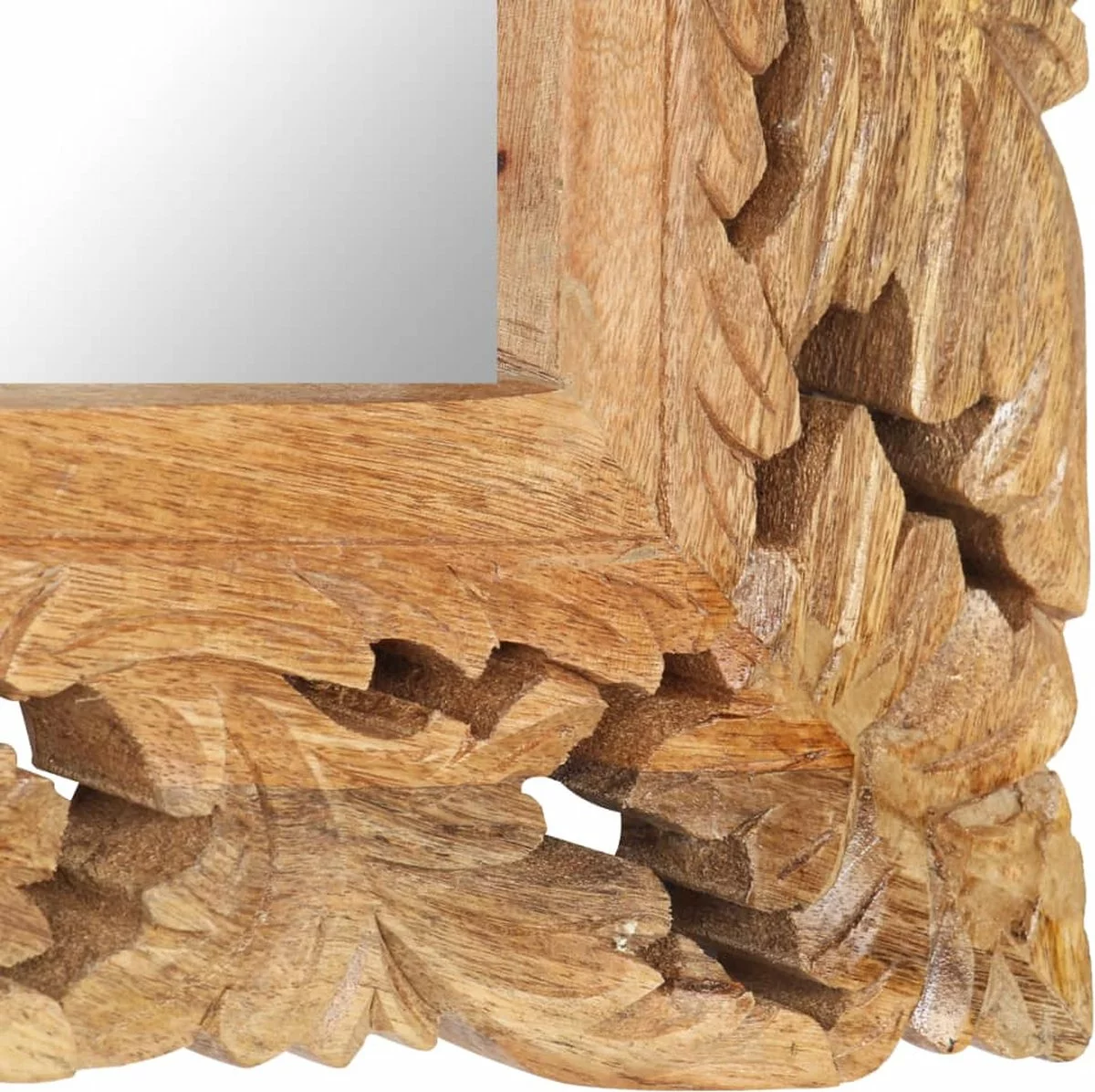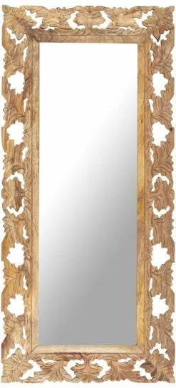 Massief mangohout is een tropisch hardhout. Het heeft de kracht om veel gewicht te dragen en is bestand tegen slijtage. Bovendien zorgen het voortreffelijke vakmanschap en de prachtige houtnerven ervoor dat elke houten spiegel net iets anders is dan de rest. Het met de hand gesneden patroon draagt bij aan de schoonheid.