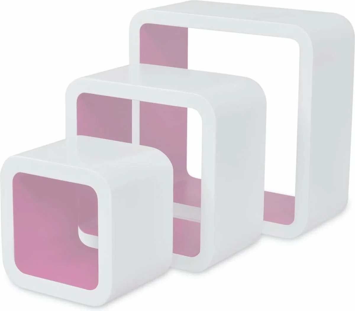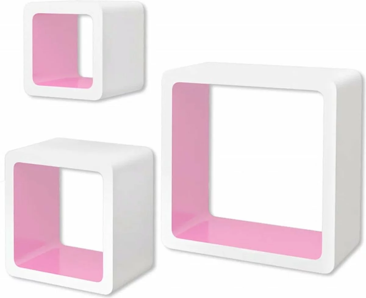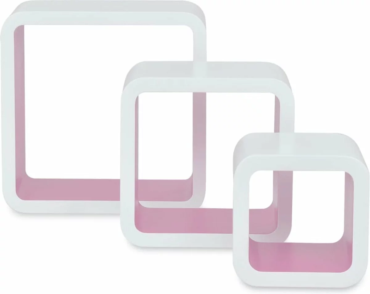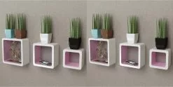 De levering bevat 6 kubusvormige wandplanken, schroeven en muurpluggen.