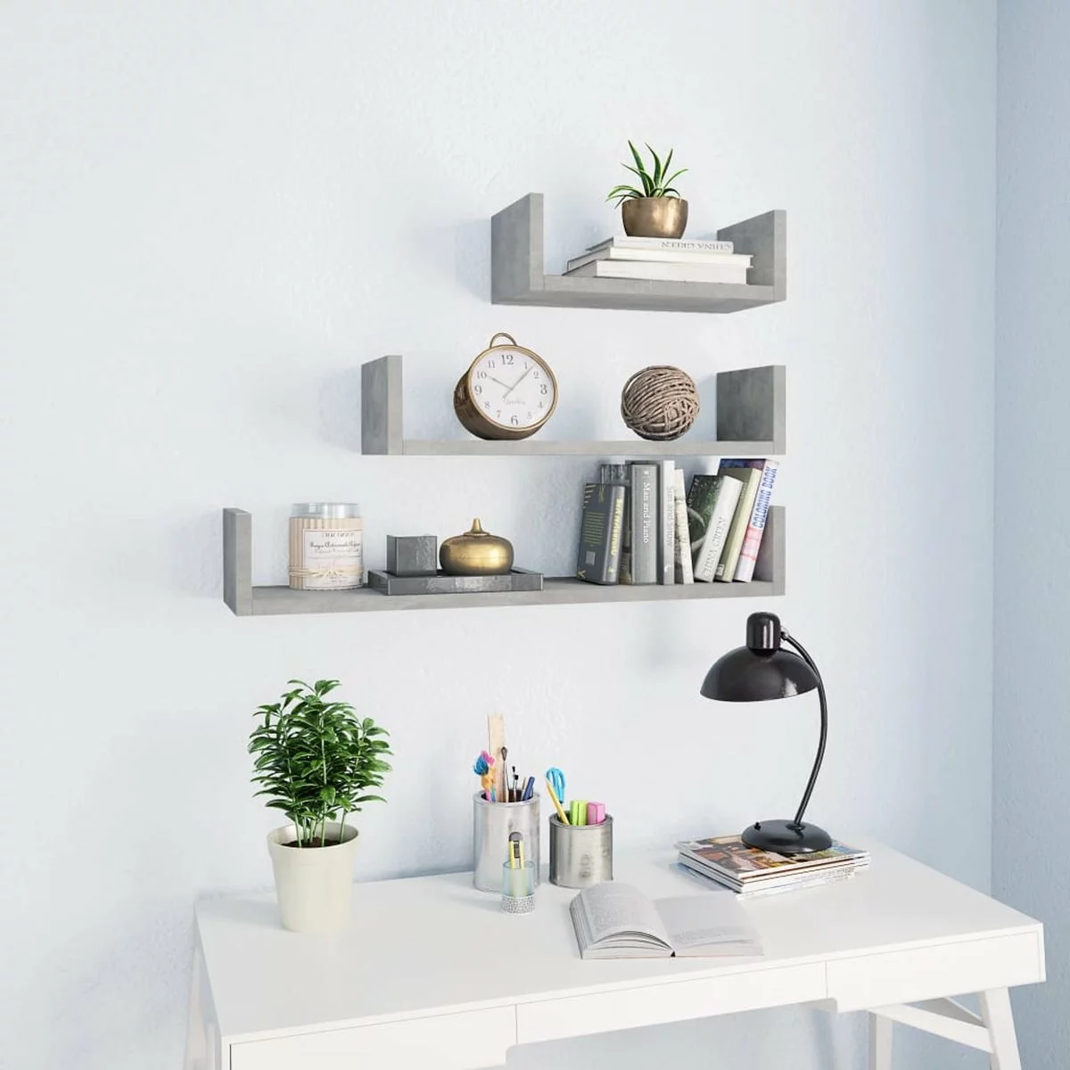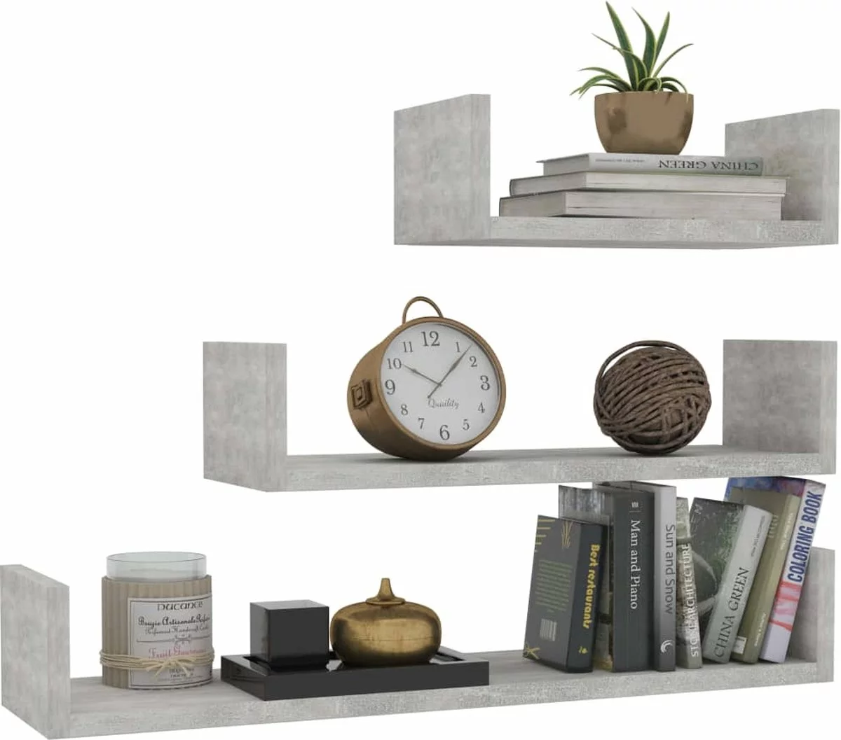 De schappen zijn gemaakt van bewerkt hout waardoor ze stevig en duurzaam zijn. Het U-vormige ontwerp biedt perfecte weergave- of opbergruimte voor boeken, cd’s, bloemen en andere spullen.