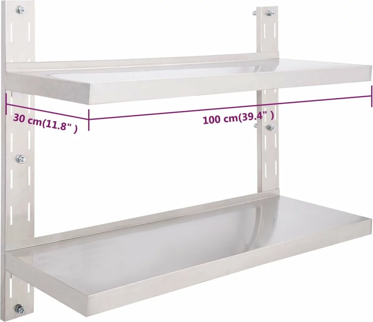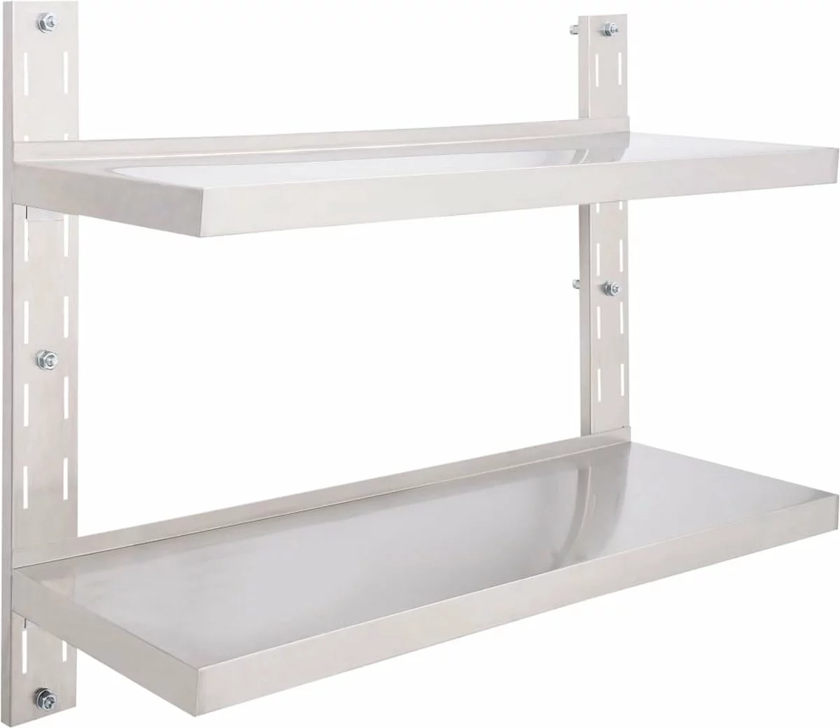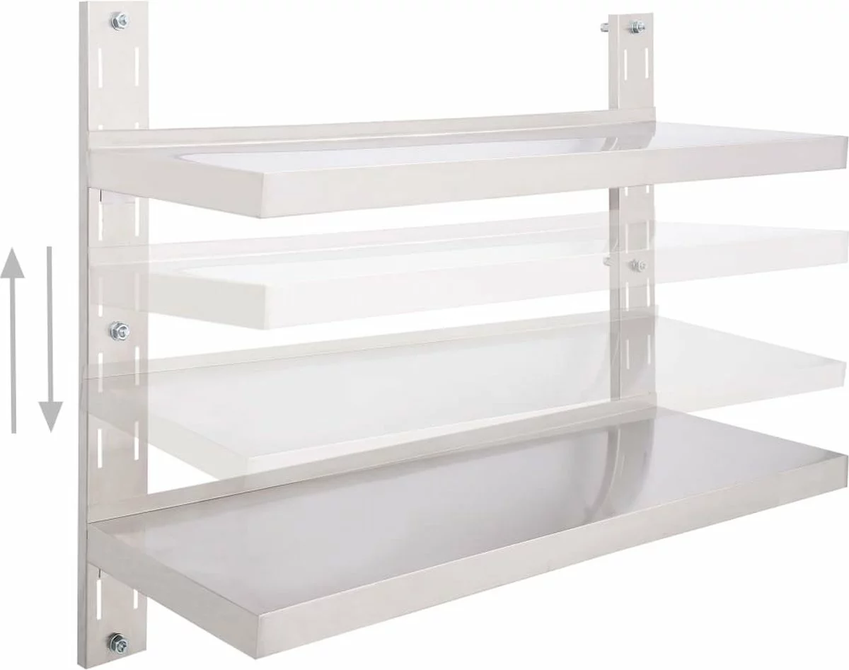 Ons 2-laags roestvrijstalen wandschap is niet alleen stijlvol, maar ook zeer functioneel. Het is een uitstekende keuze voor mensen die behoefte hebben aan extra opslagruimte in keukens. Het is een perfecte plek voor het bewaren van borden, schalen en andere keukenartikelen.